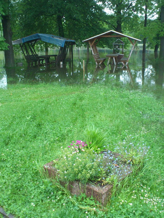 | Leider sieht es so aus, dass uns in diesem Jahr wieder eine Hochwasserkatastrophe bevorsteht. Die Bilder vom 2. Juni zeigen, wie schnell und in welchen Mengen das Wasser auf unsere Anlage vorgedrungen ist. Ob unsere kurzfristigen Sicherungsmaßnahmen etwas bringen, werden wir leider erst sehen, wenn das Wasser wieder abgeflossen ist. | |||||||||||||||||